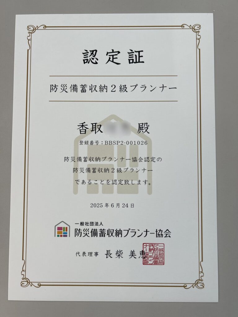 皆様にお知らせです。弊社事務の香取が防災備蓄収納2級プランナーの資格に合格いたしました🎉